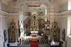 Im Inneren erhebt sich ein Netzrippengewölbe auf Konsolen. Die Gewölbemalereien im Chorschluss mit Blumenranken, Wappenmedaillons, Christus- und Marienmonogramm sowie einer Monstranz im Zentrum stammen aus der zweiten Hälfte des 16. Jahrhunderts. Das frühbarocke Wandgemälde einer Kreuzabnahme an der Westwand wurde übertüncht. Die Seccomalerei eines Totengerippes mit Lorbeerkranz an der Südwand stellt den Triumph des Todes dar. Neben einer Sakramentsnische mit geradem Sturz gehört ein 1659 geschnitztes Kruzifix zur Einrichtung.