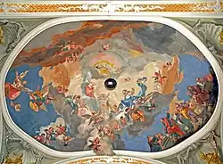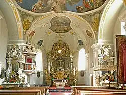 Das Kircheninnere zeigt zwei Vorjoche unter einer Stichkappentonne mit flachen Gurtbögen. Der querschiffartig erweiterte Mittelraum ist mit einer ovalen Pendentif-Flachkuppel überwölbt, deren dominierender Charakter durch die Malerei einer gewaltigen Himmelsszenerie noch verstärkt wird. Der Chor mit einer Wandgliederung mit Schichtpilastern schließt mit einem Dreiseitschluss. Im ersten Chorjoch sind Portale mit geohrter Stuckrahmung zum Turm und zur Sakristei, links darüber gibt es ein Oratorium mit einem Zugang zur Kanzel auf Volutenkonsolen mit von Rocaillen und Vasen bekrönendem Gitter, darüber zeigt sich ein gemaltes Scheinfenster, rechts zeigt sich eine Blindfensternische.