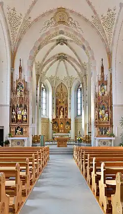 Der Chor ist 11,5 Meter lang, 9 Meter breit und hat eine Höhe von 13 Meter und wird von Seitenaltären flankiert und mit drei Sandsteinstufen zum Langhaus abgegrenzt. Früher bestand nur eine Chorstufe. Diese wurde bei der Renovierung von 1988 bis 1990 ausgebaut und dient nun als eine der Sitzbänke in der neu geschaffenen Unterkirche. Diese Chorstufe war ein besonderer Stolz der Handwerker, „Schlifar“, und hatte eine Länge von zehn Meter an einem Stück.