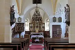 Der Hochaltar ist ein neugotischer Flügelaltar. Im Gesprenge sieht man unter und neben dem Kruzifix elf Statuen. Es sind dies die Heiligen Namenspatrone der im Herbst 1850 aus zwölf Personen bestehenden Liechtenstein’schen Familie (zwei Familienmitglieder hatten denselben Namenspatron):