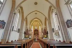 Das Langhaus der Kirche ist vierjochig und kreuztonnengewölbt. Zwischen den Gewölben sind spitzbogige Gurtbögen. Diese ruhen auf Wandpfeilern und Diensten. Die nördlich liegende Empore ruht auf zwei Säulen. Zwischen Chor und Langhaus befindet sich ein spitzbogiger Triumphbogen. Der Chor ist einjochig und schließt im 3/8-Schluss unter Kreuzrippengewölbe.[2]