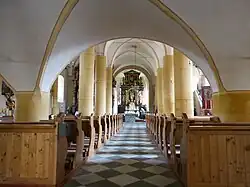 Im dreischiffigen, sechsjochigen Langhaus erhebt sich ein Kreuzgratgewölbe über mächtigen Rundpfeilern und Wandpfeilern mit Schaftringen, die mit den Strebepfeilern an der Außenseite korrespondieren. Die dreiachsige Westempore ist kreuzgratunterwölbt. Die beiden Seitenschiffe sind im östlichsten Joch abgemauert. Im nördlichen Seitenschiff befindet sich das Erdgeschoß des ehemaligen Nordturms, im südlichen Seitenschiff die barocke Sakristei und darüber eine barocke Empore. In diesem südlichen Bauteil sind die Mittelschiffpfeiler mit Schaftringen ausgestattet. Der leicht eingezogene, rundbogige, abgefaste Triumphbogen geht in die Chorwand über. Über dem einjochigen Chor mit Fünfachtelschluss wölbt sich eine barocke Tonne. Die Neigung der romanischen Gewölbe ist noch an der Form der Freskenreste ablesbar.
