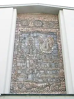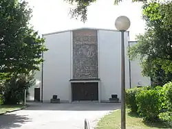 Die Kirche ist nach Westen orientiert, der Turm steht als Campanile frei auf dem Vorplatz. Über dem Portal befindet sich ein Mosaik des hl. Bartholomäus, das von Emil Wachter aus Natursteinen geschaffen wurde. Der Apostel Bartholomäus ist auf der linken Seite des Mosaiks zu sehen. Der Legende nach soll er in Armenien das Evangelium verkündet und dort den Märtyrertod erlitten haben: Bei lebendigem Leibe wurde ihm die Haut abgezogen, anschließend wurde er enthauptet. Dementsprechend ist rechts ein Messer zu erkennen und der Apostel trägt seine eigene Haut über den Schultern und vorne nach unten hängend.[2] Unterhalb des Messers sind die Mauern einer Stadt erkennbar, es ist eine Darstellung des „himmlischen Jerusalems“, das in der Offenbarung des Johannes (Offb 21,9 ff) als Stadt mit einer hohen Mauer und zwölf Toren beschrieben wird.[2] Am unteren Rand des Mosaiks liegt eine Schlange als Symbol des Satans zu Füßen des Apostels. Am oberen Rand sind drei Kreise mit Symbolen der Dreifaltigkeit zu sehen, links ein Auge für Gottvater, rechts eine Hand für Jesus Christus und in der Mitte eine Taube für den Heiligen Geist.[2]