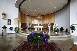 Der Altarraum nimmt die Ellipsenform des Turmes auf. Das Gestühl ist in der Art schlichter hölzerner Parkbänke ausgeführt, erinnert mit Laternenreihen an Park-Möblierung, und nimmt so die Formen aus dem Innenhof wieder auf.[11] Die Ausrichtung der Kirchenbänke zum Altarraums ist derart gewählt, dass erstere nicht auf den schlichten Volksaltar selbst, sondern auf den Tabernakel im einen Brennpunkt der Ellipse ausgerichtet sind. Im anderen Brennpunkt steht der Ambo.[1] Dieser subtile Bruch der gewohnten Achsenführung verdeutlicht noch einmal das Motto der Außenfassade. Die Kreuzwegfenster, rechterhand neben dem Altar,[12] in rhythmischer Anordnung auch an der Außenmauer sichtbar, stammen aus der Werkstatt des Stiftes Schlierbach in Oberösterreich.[4]