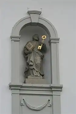 Eine Halbkreistonne, in die spitzbogige Stichkappen schneiden, überwölbt den Chorraum, das Deckenbild stellt das heilige Abendmahl dar. Die Ansätze des Gewölbes ruhen auf Konsolen mit Eierstab. Die Retabel des Hochaltars besteht aus schwarzgrauem Stuckmarmor und besitzt die Form einer Ädikula mit doppelter Säule, die von lebensgrossen Figuren der Heiligen Benedikt und Bernhard flankiert wird. Auf dem Hauptblatt sind die Muttergottes und der Apostelfürst zu sehen, auf dem Oberblatt der Heilige Burkard. An der Nordseite führt ein Zugang ins Innere des Kirchturms, in dem sich auch die Sakristei befindet.[11]