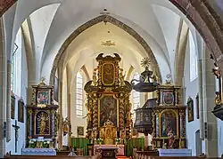 Der Hochaltar von 1705 hat einen später veränderten Rokoko-Tabernakel mit einer Kreuzigungsgruppe. Die Statuen sind vermutlich von der Bildhauerfamilie Schwanthaler. Die Seitenaltäre entstanden um 1680. Der linke Seitenaltar trägt eine Figur Maria mit Kind aus dem 17. Jahrhundert. Im Langhaus ist eine Figurengruppe Krönung Mariens aus dem zweiten Viertel des 18. Jahrhunderts.