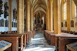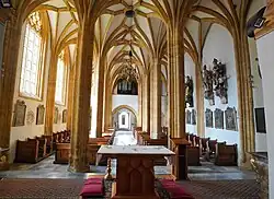 Die dreischiffige fünfjochige Hallenkirche hat Sternrippengewölbe, im Mittelschiff sechsstrahlig, in den Seitenschiffen vierstrahlig, die Schlusssteine sind rund- oder schildförmig. Im Emporenjoch gibt es ein Meisterzeichen, dasselbe wie bei der Leonardikirche in Murau. Das Gewölbe ruht auf 3/4-Runddiensten auf profilierten Vorlagen, die Vierkantpfeiler sind gekehlt. Der Boden im Langhausostjoch ist um vier Stufen höher. Der breite spitzbogige Fronbogen hat seitlich Gewölberippen-Konsolen. Der schmälere und um eine Stufe höhere Chor ist zweijochig mit einem Fünfachtelschluss, der Chor hat ein verzogenes Springrautenrippengewölbe auf mächtigen Halbrunddiensten mit Achteckbasen, im Chor gibt es kleine Figurennischen mit Konsolen und Baldachinen. Die Kirche hat runde Schlusssteine mit den Darstellungen Taube, Lamm Gottes, Köpfe und Engel.