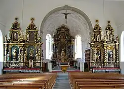 Der Hochaltar von 1673 wurde bereits 1790 stark verändert und mit Holzstatuen von Joseph Anton Janser geschmückt.
