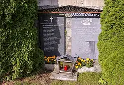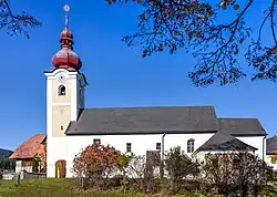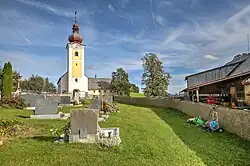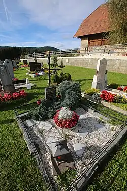Auf der westlichen Seite der Kirche befindet sich der Friedhof. Rechts vom Eingang an der Friedhofsmauer befindet sich das Kriegerdenkmal, bestehend aus zwei überdachten Natursteinplatten mit den Namen der Gefallenen beider Weltkriege.[14] Gefallene kamen auch aus den Weilern Schneßnitz, Gassarest, Mitterdorf, Pölling und St. Peter.