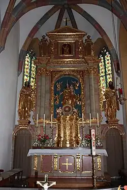 Die barocken Altäre stammen aus dem späten 17. Jahrhundert. Die Mittelnische des Hochaltars birgt eine Madonna mit Kind. Über den Opfergangsportalen stehen die Heiligen Josef und Joachim. Die Bilder der beiden Pfeileraltäre wurden im 19. Jahrhundert gemalt, links Anna selbdritt, rechts der Abschied Christi von seiner Mutter. Im linken Seitenschiff ist eine Lourdesgrotte. Der Rosenkranzaltar im rechten Seitenschiff zeigt am Altarblatt vom Ende des 17. Jahrhunderts eine Rosenkranzmadonna mit den heiligen Dominikus und Katharina von Siena, umgeben von Rundmedaillons mit den Rosenkranzgeheimnissen. Die um 1520 entstandene spätgotische Steinkanzel mit gewundener Treppe und Maßwerksbrüstung steht am südöstlichen Pfeiler des Langhauses. In den Nischen am Kanzelkorb stehen die barocken Schnitzfiguren der vier Kirchenväter. Über dem Triumphbogen sind die barocken Statuen einer Madonna und zweier Heiliger angebracht. Die lebensgroßen Statuen der zwölf Apostel und der Heiligen Leonhard und Ulrich an den Wänden des Kirchenschiffs wurden in der zweiten Hälfte des 17. Jahrhunderts gefertigt.