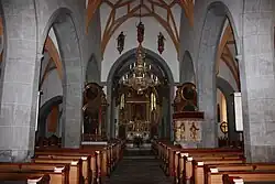 Im Mittelschiff erhebt sich ein Netzsternrippengewölbe über Konsolen. Die spitzbogigen Scheidbögen ruhen auf achteckigen Pfeilern. Die ehemaligen Obergadenfenster wurden vermauert. Die Rippen des Strenrippengewölbes im linken Seitenschiff schließen an die Wand an und überkreuzen sich. Das Sternrippengewölbe im rechten Seitenschiff ruht wandseitig auf polygonalen Diensten und gegen das Mittelschiff hin auf Konsolen. Die Westempore ist mit Sterngraten bzw. mit Kreuzgraten unterwölbt. Die Emporenbrüstung ist mit reichem Blendmaßwerk verziert. Ein Treppentürmchen in der Nordwestecke führt auf die Orgelempore. Die Maßwerkfenster im Langhaus wurden im 19. Jahrhundert erneuert.