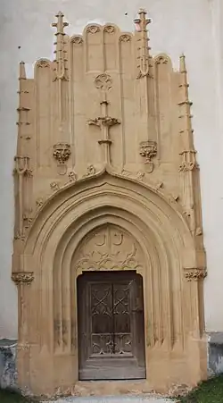 Die Kirche ist eine spätgotische, dreischiffige Hallenkirche mit basilikalem Querschnitt unter einem Satteldach. Die zwei Türme befinden sich in den Achsen der Seitenschiffe neben dem ersten Chorjoch. Sie besitzen im Glockengeschoß Zwillingsfenster und werden von Zwiebelhelmen aus dem 19. Jahrhundert bekrönt. Die Strebepfeiler sind am südlichen Seitenchor dreistufig, an Hauptchor und Langhaus zweistufig. Das rundbogige Nordportal mit verstäbter Rahmung ist 1514 datiert. Das Südportal entstand um 1500 und besitzt ein mehrfach gekehltes Gewände und Blendmaßwerk im Tympanon. Über dem äußeren Bogen mit Blattkapitellen, Krabben und Kreuzblume ist das Portal mit Blendbogenfeldern und Fialen geschmückt. Die Westfassade wurde im 19. Jahrhundert verändert und weist schmale Spitzbogenfenster mit Maßwerksnasen und Rundfenster mit Maßwerk auf. Aus der Gotik stammt das profilierte Westportal.