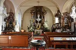 Der Hochaltar aus dem ersten Viertel des 18. Jahrhunderts wurde 1851 erneuert. Die Rokoko-Seitenaltäre tragen in der Mitte Statuen. Die Kanzel entstand im zweiten Drittel des 18. Jahrhunderts.