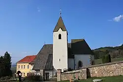 Der Chor ist in der nördlichen Ecke am Dachgesims mit 1558 bezeichnet und an den östlichen Ecken mit Steinköpfen versehen. An der Südseite des Langhauses steht der gotische Kirchturm mit Pyramidendach, daran westlich und südlich an den Chor schließt die Sakristei. Das rechteckige gotische Westportal besitzt eine Holztür mit vermutlich romanischen Eisenbeschlägen. Die Dächer sind mit Steinplattln gedeckt.
