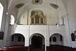 Die Kirche hat eine einfache Empore. Ein Triumphbogen trennt die polygonal geschlossene Apsis (mit Kappengewölbe) vom Rest der Kirche.