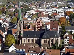 Bis zur Fertigstellung der neuen Stadtpfarrkirche hatte die mittelalterliche Dorfkirche als Pfarrkirche gedient. Die neugotische Hallenkirche wurde 1896 nach einem Entwurf von Max Meckel aus Quadermauerwerk aus rotem Sandstein errichtet, deren Wände von Strebepfeilern gestützt werden. Sie besteht aus einem Langhaus mit einem Mittelschiff und zwei Seitenschiffen, einem eingezogenen, dreiseitig geschlossenen Chor vor dem Mittelschiff im Süden, dem dazwischen liegenden Querschiff, und einem Fassadenturm im Norden, dessen oberstes Geschoss die Turmuhr und den Glockenstuhl beherbergt, in dem vier Kirchenglocken der Glockengießerei Grüninger aus dem Jahr 1950 hängen.[1] Darauf sitzt ein spitzer Helm. Die Orgel wurde 1978 von Claudius Winterhalter gebaut.[2]