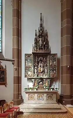 Der Hochaltar, ein Flügelaltar, wurde nach einem Entwurf von Friedrich von Schmidt und Josef Schmid von Josef Andergassen gebaut und 1891 aufgestellt. Die polychromen Plastiken schuf Serafin Eberhart. Ein hoher Tabernakel, geschaffen von Jakob Rappel, trennt den Schrein in der Mitte, die Figuren stellen links die hll. Sebastian und Florian, rechts die hll. Nikolaus und Martin dar. Die Innenflügel zeigen Reliefs der Geburt Jesu und der Anbetung der Könige. An den bei geschlossenem Schrein sichtbaren Außenseiten der Flügel befinden sich von Hans Rabensteiner gemalte Szenen aus der Passion Christi. Den Schrein flankieren Statuen der hll. Petrus und Paulus. Im hohen Gesprenge befinden sich Statuen der hll. Katharina und Barbara, an oberster Stelle ein Kruzifix, darunter Maria und Johannes.