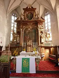 Der spitzbogige Triumphbogen ist leicht eingezogen. Der zweijochige Chor mit einem Fünfachtelschluss ist gleich hoch wie das Langhaus und hat ein Netzrippengewölbe auf hoch sitzenden runden Konsolen. Das schulterbogige Sakristeiportal hat ein verändertes Gratgewölbe mit Stichkappen. Eine spätgotische Sakramentsnische wird vom Chorgestühl verdeckt.