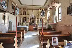 Das Langhaus ist flachgedeckt, über dem einjochigen Chor mit Fünfachtelschluss erhebt sich ein Kreuzgratgewölbe. Die historistische Ausgestaltung der Kirche stammt von 1880, die Ausmalung mit Dekorfries von 1929. An der Nordseite springt das polygonale Treppentürmchen mit drei Seiten in den Innenraum vor. Ein spitzbogiges Portal führt in die kreuzgewölbte Sakristei im Turmerdgeschoß. Im Chor befindet sich eine mit einem Eisengitter verschlossene Sakramentsnische.