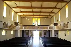 Die Kirche mit kreuzförmigem Grundriss besitzt ein abgewalmtes Satteldach und ist durch einen Laubengang mit dem freistehenden Glockenturm und dem Pfarrhof verbunden. Sie wurde von 1937 bis 1938 nach Plänen von Rudolf Wondracek erbaut, seit 1940 bildet sie das Zentrum der neuen Pfarre Wagram. Erwähnenswert sind die kunstvoll gestalteten Glasfenster.