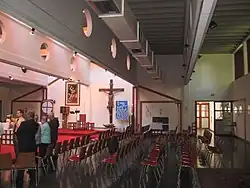 Der Kirchenraum wird von strengen kubischen Formen und einer davon ausgehenden Segmentgliederung geprägt. Das Kirchendach wird im Inneren durch fünf Betonträger gestützt, die in die architektonische Gestaltung integriert wurden. Um diese Träger transparenter zu gestalten, wurden fünf kreisrunde Öffnungen eingeplant. Die Lichtöffnungen sind im Inneren mit hellem Naturholz verkleidet.