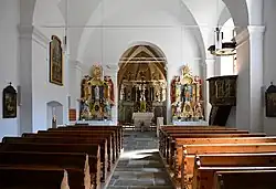 Das barockisierte dreijochige Langhaus ist stichkappentonnengewölbt auf Wandpfeilern mit einfachen Gesimskapitellen. Die barocken Langhausfenster wurden 1951 restauriert. Die neue hölzerne Westempore trägt die ursprüngliche barocke Holzbrüstung mit Apostelbildern aus dem ersten Viertel des 18. Jahrhunderts. Der barocke Fronbogen ist rundbogig. Der eingezogene einjochige Chor mit einem Fünfachtelschluss hat ein Kreuzrippengewölbe auf Konsolen, vier Konsolen zeigen kleine Köpfe. Die gotischen zweibahnigen Chorfenster mit Maßwerk zeigen mit drei Fenstern im Chorschluss gotische Glasgemälde um die Mitte des 14. Jahrhunderts mit den Darstellungen Verkündigung, Geburt, Anbetung, Heiligendarstellungen sowie den knienden Stifter Hainricus. Das mit einem Vierpass und einem Giebel ausgestattete gotische Sakramentshäuschen verfügt über ein mit Rosetten verziertes schmiedeeisernes Gitter. Das spitzbogige Sakristeiportal hat eine Tür mit einem Eisenbeschlag, die Sakristei südlich am Chor ist kreuzgratgewölbt.