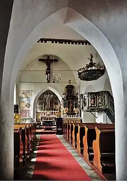 Nach dem Brand von 1765 erhielt das ursprünglich flach gedeckte Langhaus eine Stichkappentonne auf Konsolen. Die dreiachsige Steinempore ist kreuzgratunterwölbt und besitzt eine Holzbrüstung über spitzbogigen Arkaden. Der eingezogene, romanische Triumphbogen wurde an den Kanten gotisch abgefast. Im kreuzgratgewölbten Chorquadrat befindet sich eine spätgotische Sakramentsnische, die von gedrehten Säulchen und Fialen gerahmt wird. 1989 wurden an der Triumphbogenwand gotische Fresken freigelegt. An der Nordseite ist eine um 1425 gemalte Pietà zu sehen, an der Südseite eine heilige Kümmernis.