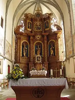 Der 1692/1694 vom Tischler Balthasar Threyer gebaute Hochaltar – den Chorschluss ausfüllend – ist ein dreiachsiger gebrochener reich akanthusüberzogener ungefasster Holzaufbau und trägt spätgotische Schnitzfiguren der Heiligen Erasmus, Wolfgang und Nikolaus (um 1490). Der Auszug zeigt das barocke Bild Marienkrönung flankiert von den Schnitzfiguren Maria und des Evangelisten Johannes (um 1490) in einer barocken Überarbeitung und ein Vorsatzbild Maria mit Kind (um 1770/1780). Die zwei Seitenaltäre im Rokoko-Stil mit Engelsfiguren von 1767 zeigen links das Altarbild Gekreuzigter aus dem 17. Jahrhundert und rechts das Altarbild Tod des hl. Josef vom Maler Martin Johann Schmidt (1766). An der Nordwand steht der Hochaltar aus 1760/1770 mit dem Altarblatt Glorie des hl. Nikolaus von Martin Johann Schmidt (1768) und trägt die Figuren Florian und Donatus, ein Vorsatzbild und Reliquientafeln. Der Bernhardsaltar in der Sakristei, eine Arbeit von Balthasar Threyer (1692), zeigt das Altarbild hl. Bernhard, den Schmerzensmann küssend. Die klassizistische Kanzel ist aus 1785.