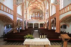 Die Kirche steht auf einer teilweise angeschütteten Höhe ob dem Marktplatz auf dem Kirchenplatz. Durch die Hanglage hat die Kirche eine acht Meter hohe Substruktion und wirkt außen geschlossen, da die Kräfte durch feingliedrige Felder eines Netzrippengewölbes innen abgeleitet werden. Die allseits umlaufende Empore mit Nahe vor der Außenwand stehenden schlanken Pfeilern macht den Kirchenraum einzigartig.[3] Als erste Kirche im deutschsprachigen Raum, Baubeginn 1421, mit statisch wirksamer voll umlaufender Empore, wird die Amberger Martinskirche angenommen, die damit auch Vorbild für spätere Kirchen in Sachsen war.[4]