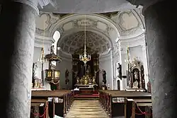 Das Langhaus ist dreijochig. Es wird durch Doppelgurtbögen unterteilt, die auf ionischen Doppelpilastern ruhen. Dazwischen ist Platzlgewölbe. Die dreiachsige Empore ruht auf Tonnengewölbe und hat eine vor- und aufwärtsgeschwungene Brüstung. Der Triumphbogen ist rundbogig. Das Chorjoch ist tonnengewölbt.
