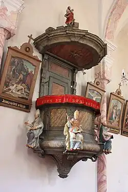Der Hauptaltar, die Freskenmalerei sowie die Kreuzwegtafeln sind mit slowenischen Inschriften versehen und geben so Zeugnis der Sprach- und Kulturgeschichte dieses Zentralortes am östlichen Rand des Klagenfurter Feldes ab. Am Friedhof finden sich allerdings nur noch wenige Grabsteine mit slowenischen Inschriften.[4][5][6][7][8]