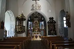 Das im Kern romanische Langhaus ist zweijochig und hat ein barockes Kreuzgratgewölbe aus dem 17. Jahrhundert, das Gewölbe ruht auf Wandpfeilern. Seitlich hat das Langhaus vier Seitenkapellen, mit Rundbogen zum Langhaus geöffnet, in den Rundbogenlaibungen gibt es teils einfache barocke Stuckfelder. Die gotische Südwestkapelle ist zweijochig mit Kreuzrippengewölben. Die Südostkapelle und die Nordostkapelle wurden 1738 erbaut, beide sind einjochig mit einem Kreuzgratgewölbe. Die Nordwestkapelle mit einem Kreuzgratgewölbe ist seicht (große Breite und geringe Tiefe im Verhältnis 4:1).