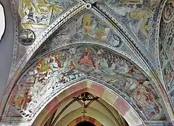 Der Triumphbogen zeigt chorseitig das Jüngste Gericht (auch Weltgericht genannt) mit Christus in der Mandorla und einem nackten Papst bei den Verdammten. In den Gewölbefeldern des Westjochs ist je ein Kirchenvater, ein Evangelistensymbol und ein Symbol eines Elements abgebildet.[10] In den Chorschlussfenstern sind Maria mit Kind und Veronika mit dem Schweißtuch, umgeben von musizierenden Engeln, wiedergegeben.[11][12][9]