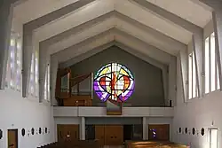 Der massiv wirkende Kirchenbau mit einem durch Betonstützen gegliederten Langhaus hat einen eingezogenen flachbogig geschlossenen Chor. Zwischen den Betonstützen sind schmale hohe Rechteckfenster. Der hohe Kirchturm verjüngt sich nach oben und schließt oben waagrecht ab. Die östliche Giebelfront hat ein breites Rechteckportal flankiert von rechteckigen ornamentalen Glasfenstern, über dem Portal ist ein weites Glasbetonrundfenster Herz Jesu.[1]