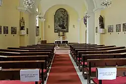 Das Altarbild zeigt den heiligen Johannes Nepomuk. Das Bild vom Ende des 18. Jahrhunderts wurde in späterer Zeit übermalt. Im Eingangsjoch befinden sich eine Bauinschrift und eine Gedenktafel für den Südtiroler Freiheitskämpfer und Pfarrer Haspinger.