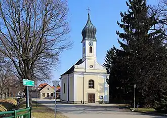 Die Kirche ist ein schlichter, spätbarocker Saalbau mit Rahmengliederung und flachrundem Chorschluss. Über der Westfassade erhebt sich ein Dachreiter mit einem gestreckten Zwiebelhelm zwischen Volutenschmiegen. An den Seitenfronten sind die Mitteltravéen leicht geschwungen vorgezogen. Die Seitenfassaden werden durch Rahmengliederungen unterteilt.