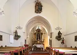 Das Kircheninnere zeigt ein Langhaus mit einem dreijochigen Kreuzgratgewölbe zwischen spitzbogigen Gurtbögen. Die einjochige Orgelempore hat eine gerade Brüstung. Der spitzbogige Triumphbogen steht auf spitzen Konsolen. Der stark eingezogene einjochige Chor mit einem polygonalen Schluss hat ein Kreuzgratgewölbe auf spitzen Konsolen. Der Turmerdgeschoß ist spitztonnengewölbt.