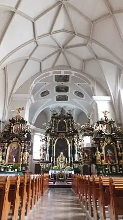 Die reichen Altäre sind aus dem dritten Viertel des 17. Jahrhunderts. Das Hochaltarbild malte Franz Xaver Gürtler (1775). Die Kanzel entstand um 1670/1680. Das Taufbecken ist spätgotisch. In der südlichen Portalvorhallennische steht die Figur Schmerzensmann aus dem dritten Viertel des 18. Jahrhunderts.