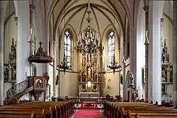 Der reich geschnitzte neugotische Altaraufsatz besitzt neun Nischen. Über dem Tabernakel befindet sich die Expositionsnische. Die meiste Zeit des Jahres steht in dieser Nische ein Kruzifix mit zwei Engeln. Während der Weihnachtszeit wird ein Prager Kindl ausgestellt, von Ostern bis Pfingsten das Lamm auf dem Buch mit den Sieben Siegeln (nach der Geheimen Offenbarung des Johannes). Darüber steht die Statue des heiligen Josef, gefertigt vom Bildhauer Josef Weyrich.[6][13]
