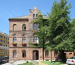 Das Wohnhaus des Pfarrers ist ein dreietagiges unverputztes Backsteingebäude mit Rundbogenfenstern und mittigen Ziergiebeln. Es steht leicht erhöht