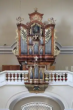 Die Orgel baute 1744 Johann Hencke, sie hat ein kleinförmig gestaffeltes dekoriertes Gehäuse mit dem eingefügten Bild Mariä Verkündigung. Das Brüstungspositiv ist wie die Orgel gestaltet. Die Orgel wurde später mehrfach verändert.[1]