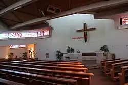 Der Innenraum zeigt sich hell und schlicht und wird – mit Ausnahme des Altarbereichs – von einem Band bunter Glasfenster umzogen. Im Zentrum des Altarraums steht der Volksaltar, rechts davon befindet sich der Ambo. An der Wand hinter dem Altar hängt ein großes hölzernes Kreuz. An der linken Seite der Kirche liegt eine Nische, die den Tabernakel beherbergt. Das Taufbecken befindet sich ebenfalls an der linken Seite der Kirche. Die Kirchenbänke sind in der Form eines halben Sechsecks angeordnet, den Fußboden bilden sechseckige, in rotbraunem Farbton gehaltene Fliesen.