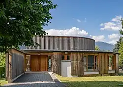 Bedingt durch eine leichte Neigung des Grundstückes wurde der Eingang in die Kirche über einen gepflasterten Weg entlang der Mauerwand in den Norden gelegt. Das Portal aus Holz ist gläsern umrahmt. Das ganze Pfarrzentrum bildet einen Zylinderbau, wovon der Eingangsbereich und der Kirchenchorbereich abweichen. Im Foyer wird die massive Ummantelung der Kirche mit Glaselementen aufgebrochen.