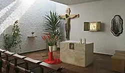 Die Kirche wurde von 1970 bis 1973 nach den Plänen der Architekten Rüdiger Stelzer und Walter Hutter erbaut. Der Pfarrhof mit Pfarrsaal und integrierter Pfarrkirche hat einen freistehenden Glockenturm. Das Bronzekreuz und den Bronzetabernakel schuf der Bildhauer Friedrich Koller 1980.