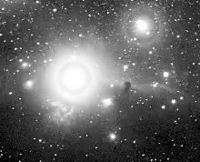 | Aufnahme des Pferdekopfnebels im sichtbaren Spektralbereich: Die namensgebende Gestalt der Dunkelwolke zeichnet sich vor dem rot leuchtenden Emissionsnebel IC 434 im Hintergrund ab. | |