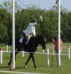 Beim Kunstreiten und beim Stuntreiten werden akrobatische Übungen auf einem sich bewegenden Pferd ausgeführt. Anders als beim Voltigieren, geht das Pferd nicht an einer Longe, sondern wird vom Sattel aus gelenkt.
