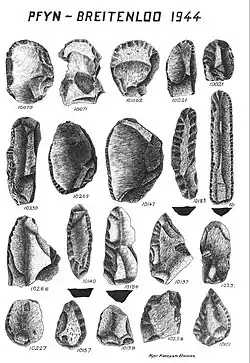 Die namensgebende Fundstelle, Pfyn-Breitenloo, wurde 1944 vom ehrenamtlichen Thurgauer Kantonsarchäologen Karl Keller-Tarnuzzer mit polnischen Internierten ausgegraben, zumeist qualifizierten Handwerkern. Die Soldaten, die am 19.–20. Juni 1940 von der Westfront in Frankreich in die Schweiz gekommen waren, erinnerten sich gerne an diese Episode in ihrem Leben.[4] Der führende Archäologe konnte seine Funde wegen der beschränkten Kapazitäten nur vorläufig beschreiben,[5] systematisch ausgewertet wurden sie erst Ende des 20. Jahrhunderts.[6]