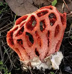 - Ileodictyon Tul. ex M.Raoul (1844): Die Fruchtkörper sind vergittert und bestehen aus gelatinösen Ästen, welche von der Volva ausgehen. Die Sporen sind elliptisch und werden 4–6 × 1,5–2,5 µm groß.[6] Der in Neuseeland heimische „Korbpilz“, Ileodictyon cibarium, erinnert an einen runden oder ovalen Ball, welcher aus miteinander verflochtenen oder vergitterten Ästen zusammengesetzt ist.