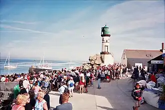 Er ersetzte eine Bake, die sich vorher an der Stelle der Leuchtturms befand. Der zylindrische Turm steht auf einem weiß gestrichenen Sockel.