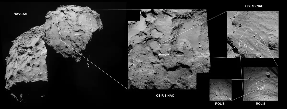 Vor der Entsendung von Philae wurde die Oberfläche des Kometen durch Rosetta optisch kartografiert und analysiert, da ihre Beschaffenheit vor dem Eintreffen der Sonde nicht genau bekannt war. Nach der Abtrennung sollte sich Philae dem Kometen im freien Fall nähern und mit einer Geschwindigkeit von etwa 1 m/s mit Hilfe seines Landegestells auf dem Kometen aufsetzen, möglichst ohne wegen der niedrigen Schwerkraft wieder abzuprallen. Die Gravitationsbeschleunigung des Kometen an seiner Oberfläche wurde damals auf 10−3 m/s² geschätzt.[17]